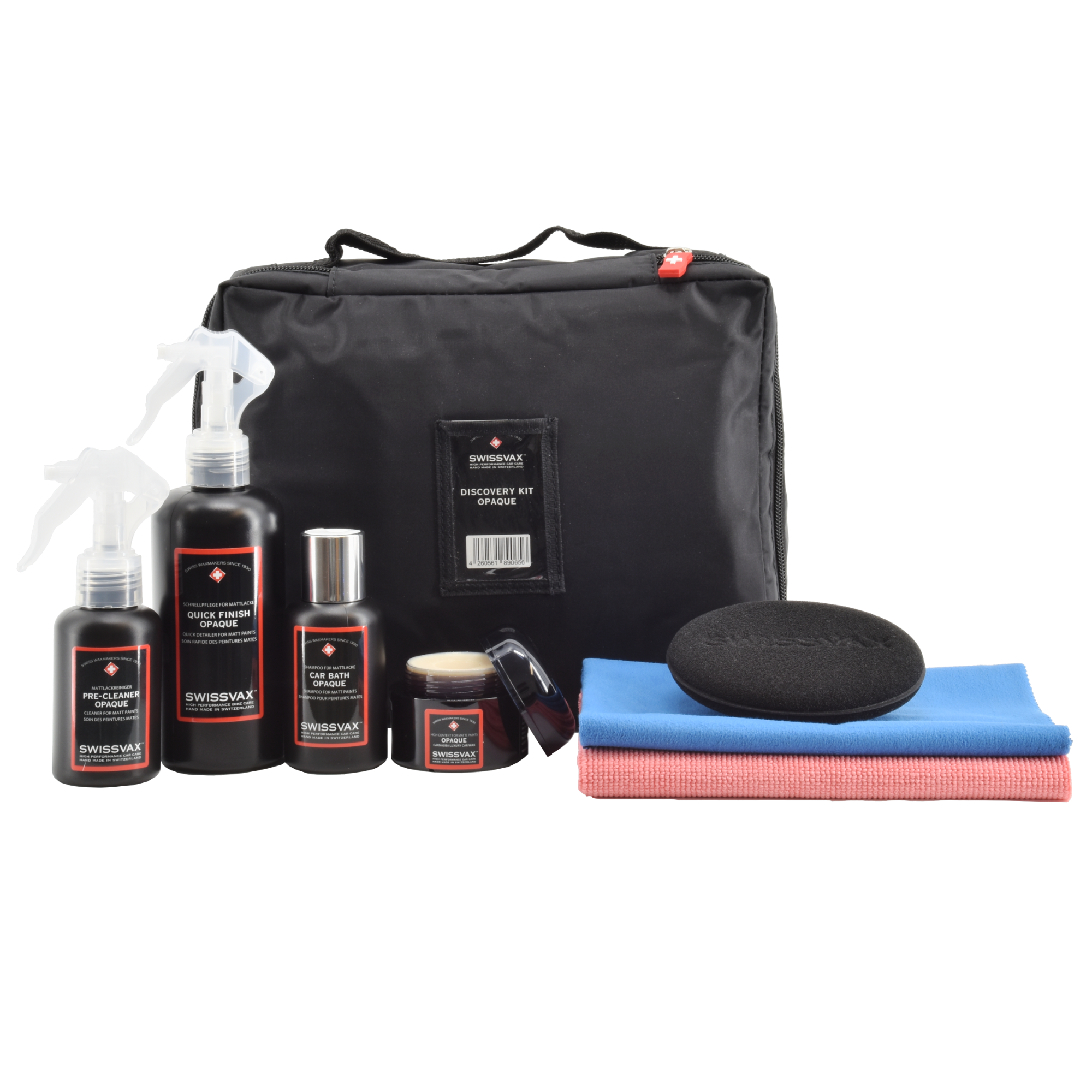 V praktické brašně najdete Swissvax Opaque vosk, Swissvax Pre-Cleaner Opaque, Swissvax Car Bath Opaque, Swissvax Quick Finish Opaque, Swissvax Micro Absorb a Swissvax Micro Polish. Více informací