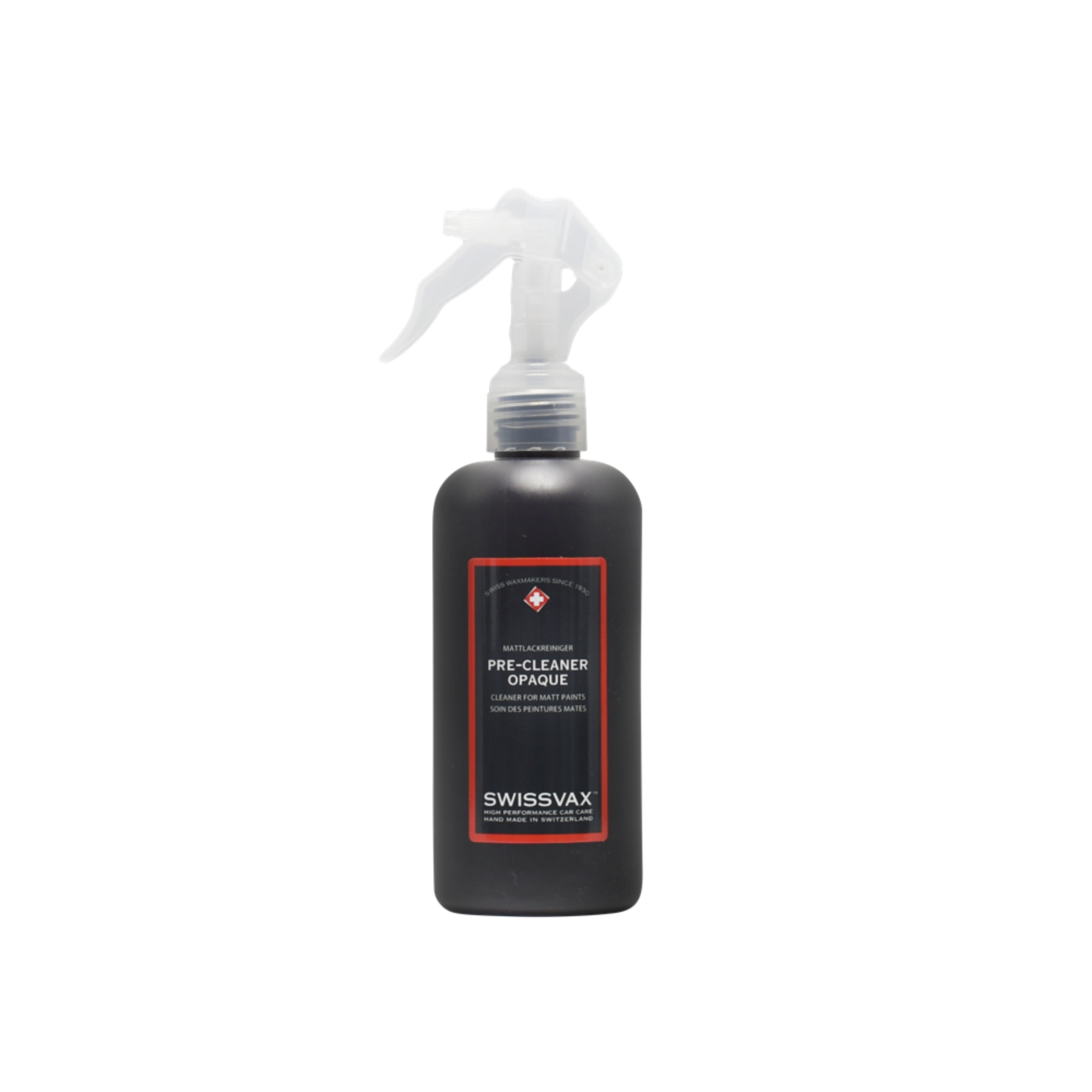 Swissvax vytvořil sérii produktů Opaque pro matné laky (včetně matných folií).Pre-Cleaner Fluid je speciálně vytvořený čistič pro matný povrch laku. Odstraníte jím bez problémů mastnotu, nečistoty nebo ptačí trus, získáte bezchybně čistý povrch matného laku, který je nezbytnou podmínkou pro voskovou vrstvu. Jen s perfektní přípravou Vašeho laku je možné dosáhnout dokonalé a dlouho trvající ochrany a vzhled matného laku bude zachován.